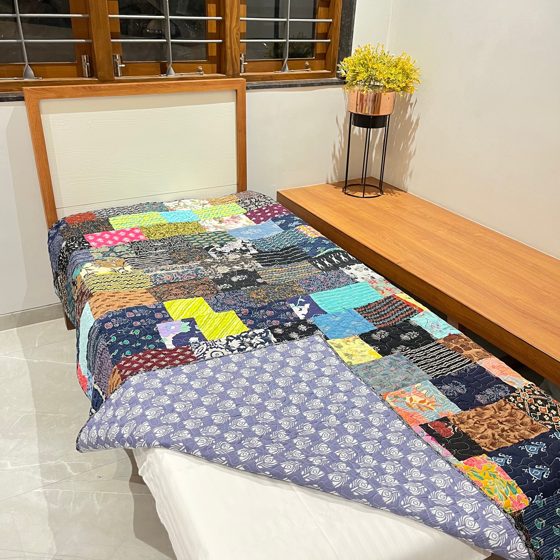 Patchwork Dohars are a beautiful fusion of artistic craftsmanship, comfort, and rich heritage. Expertly handcrafted, each dohar combines vibrant pieces of fabric, carefully sewn together to create a unique, one-of-a-kind pattern. With each patch representing a different texture, color, and design, the patchwork dohar tells a story of artistry, tradition, and warmth.