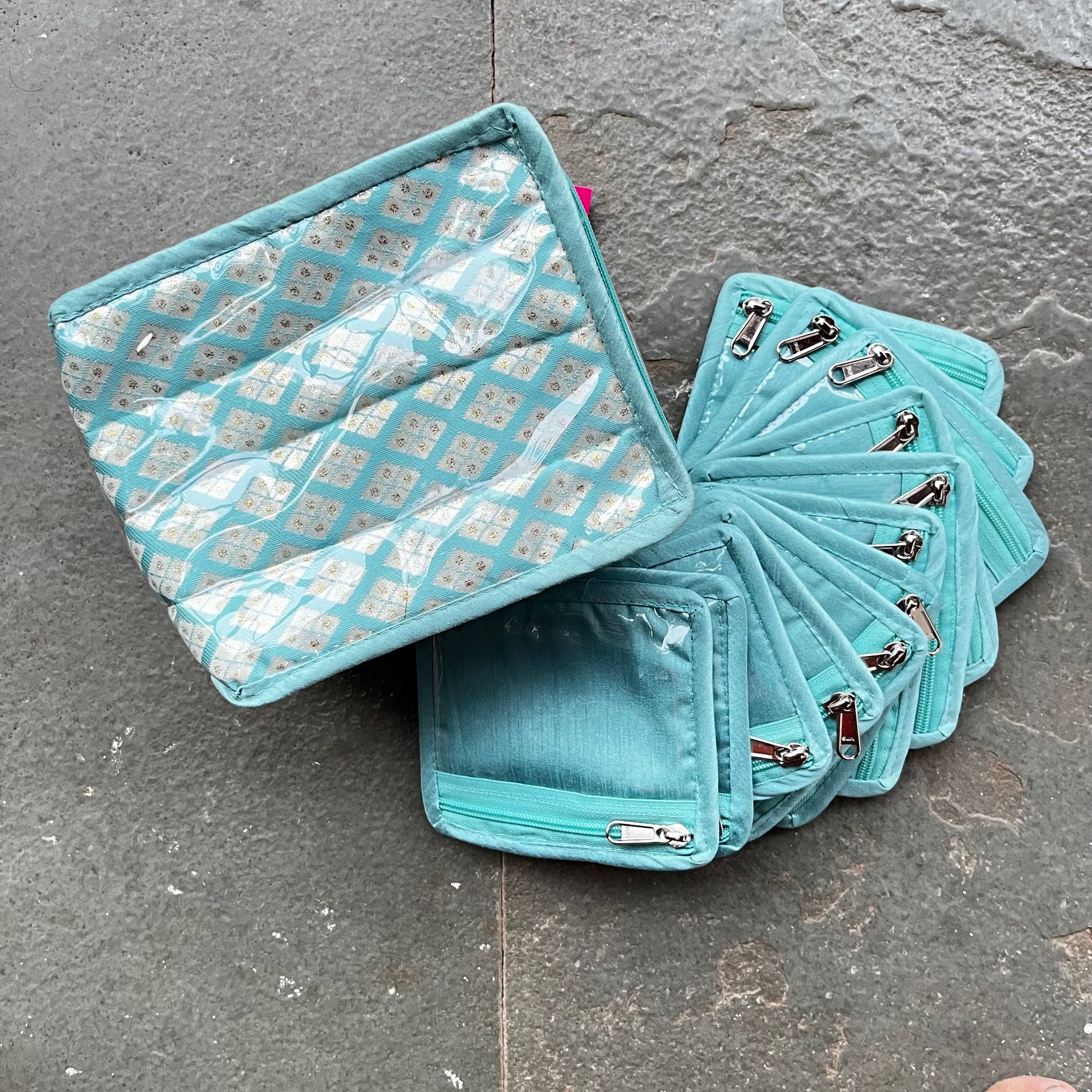 The set includes multiple smaller zippered pouches with clear plastic fronts and metal zipper pulls.