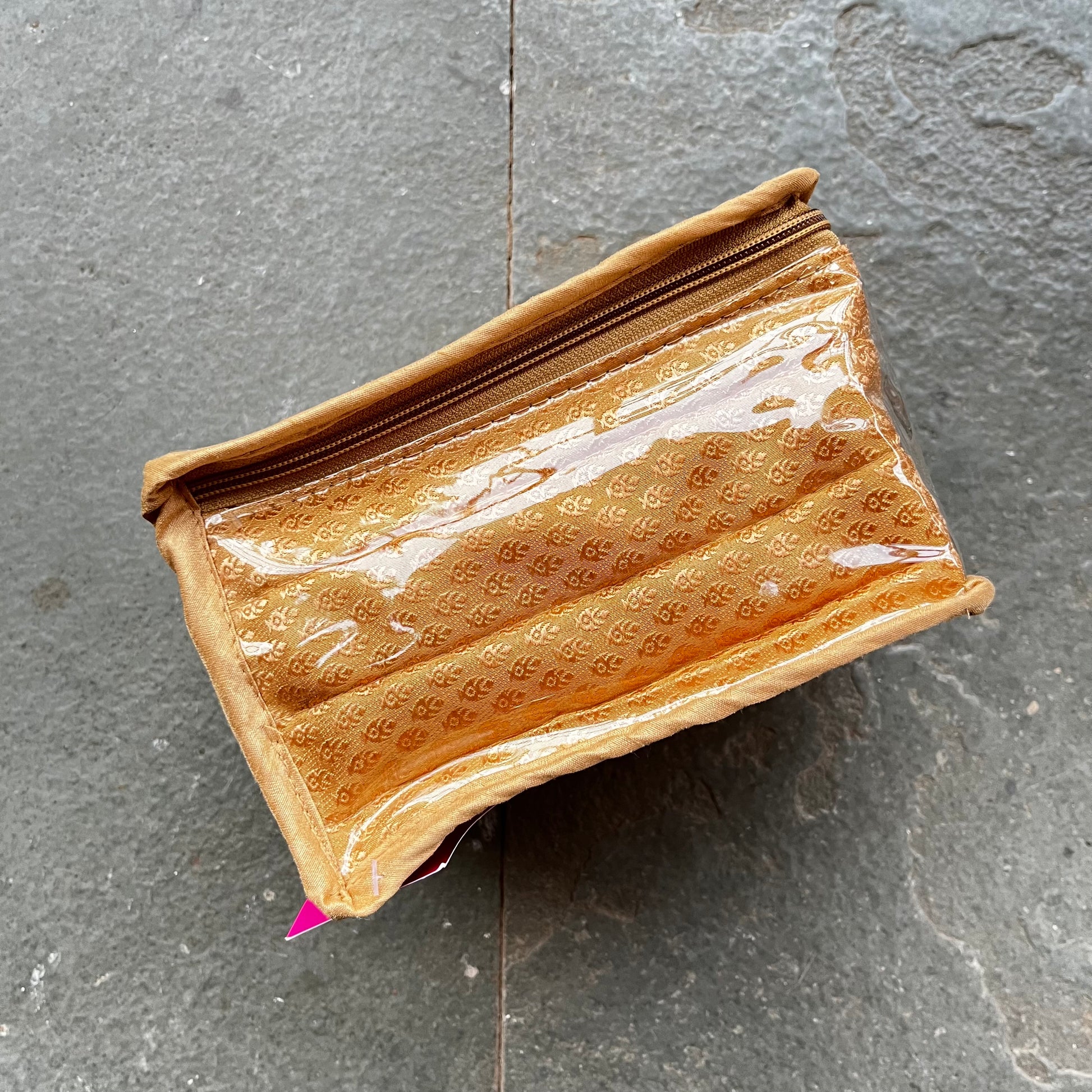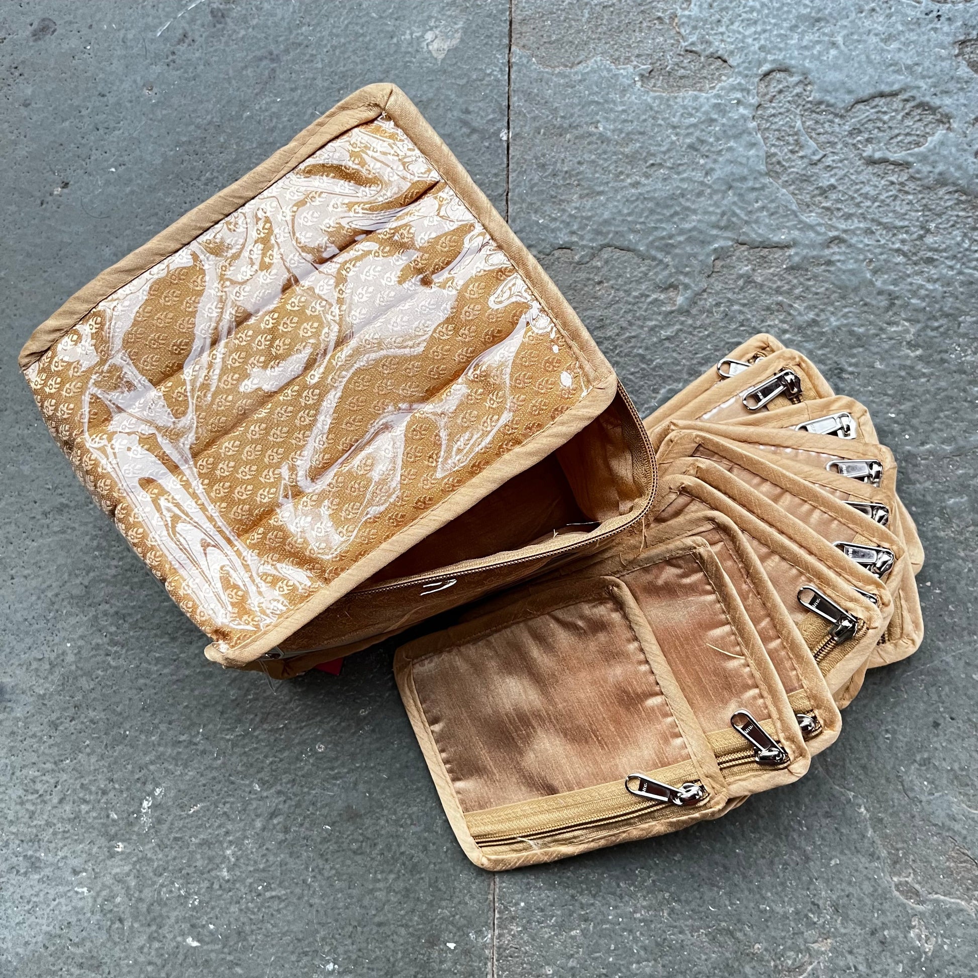 The set includes multiple smaller zippered pouches with clear plastic fronts and metal zipper pulls.