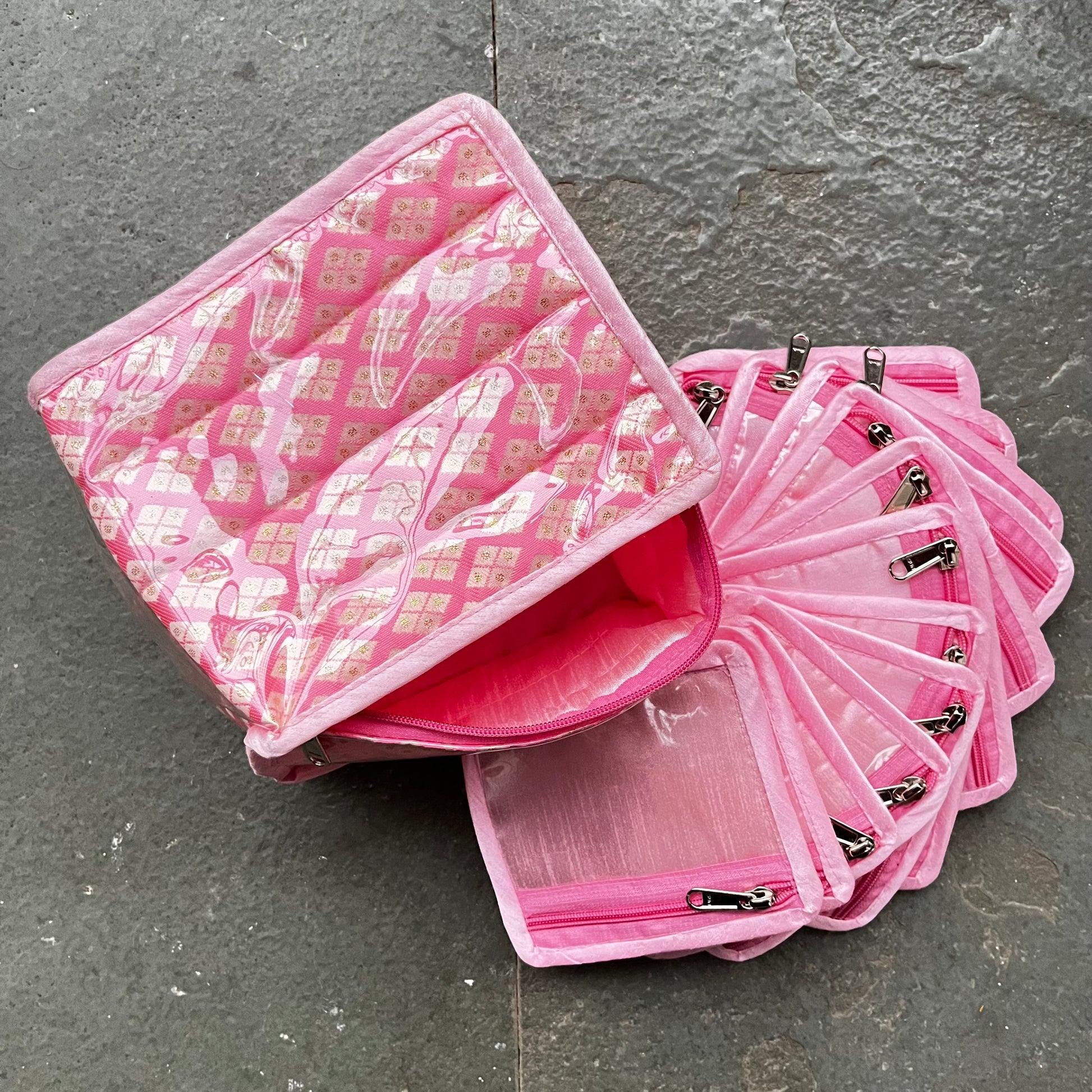 The set includes multiple smaller zippered pouches with clear plastic fronts and metal zipper pulls.
