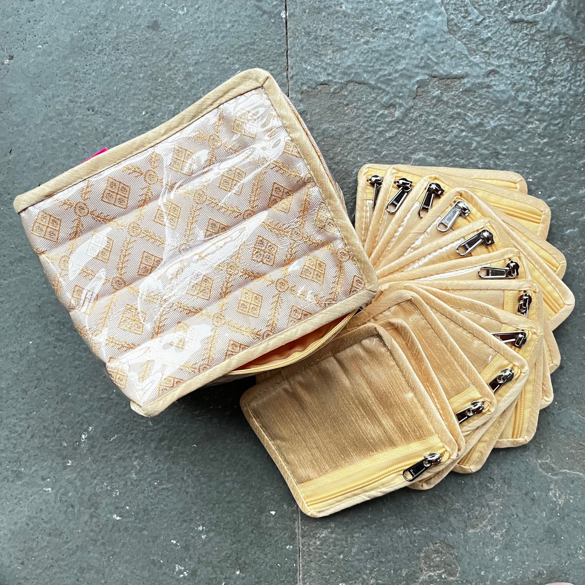 The set includes multiple smaller zippered pouches with clear plastic fronts and metal zipper pulls.
